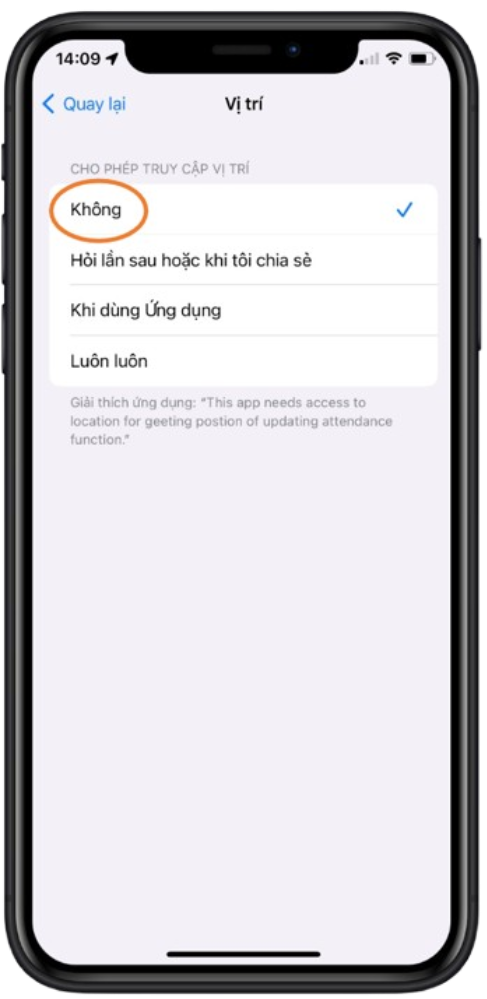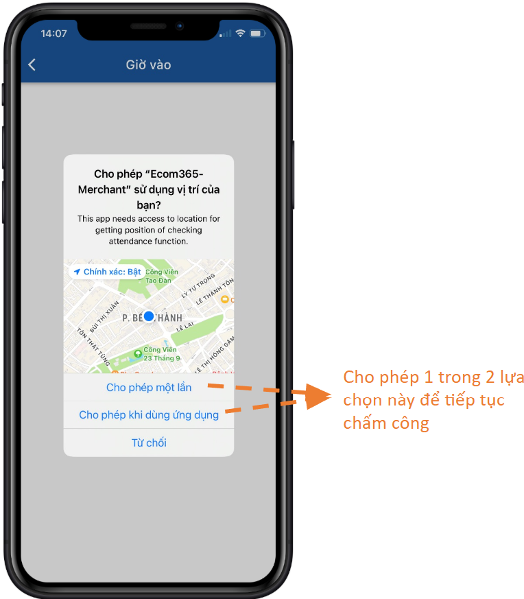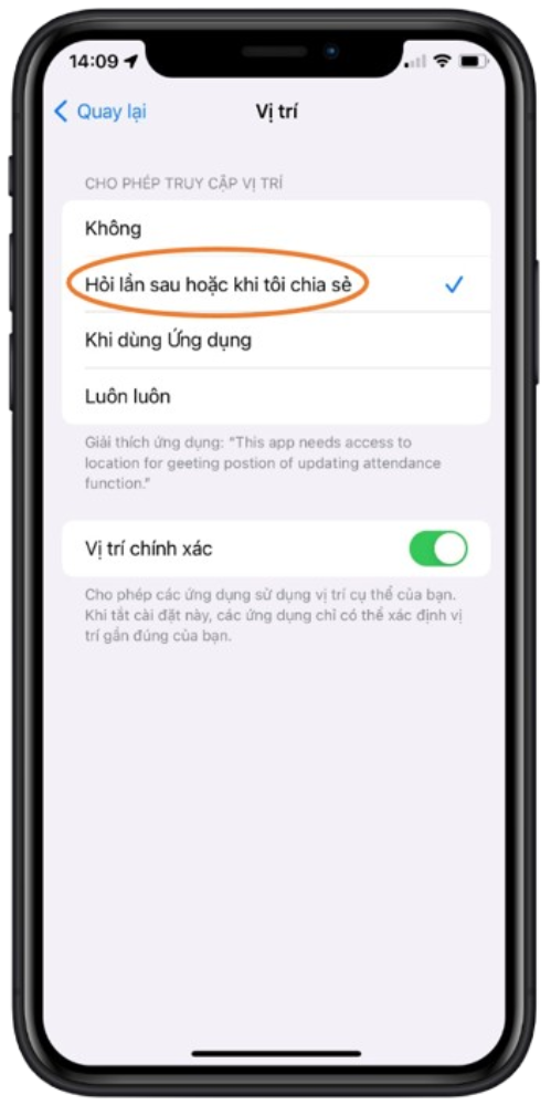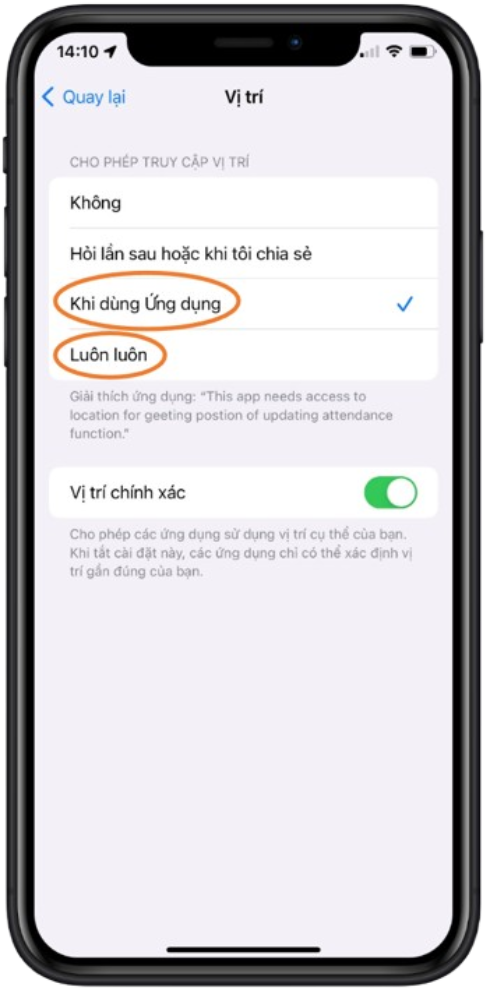 - Chọn Khi dùng ứng dụng hoặc Luôn luôn để chấm công