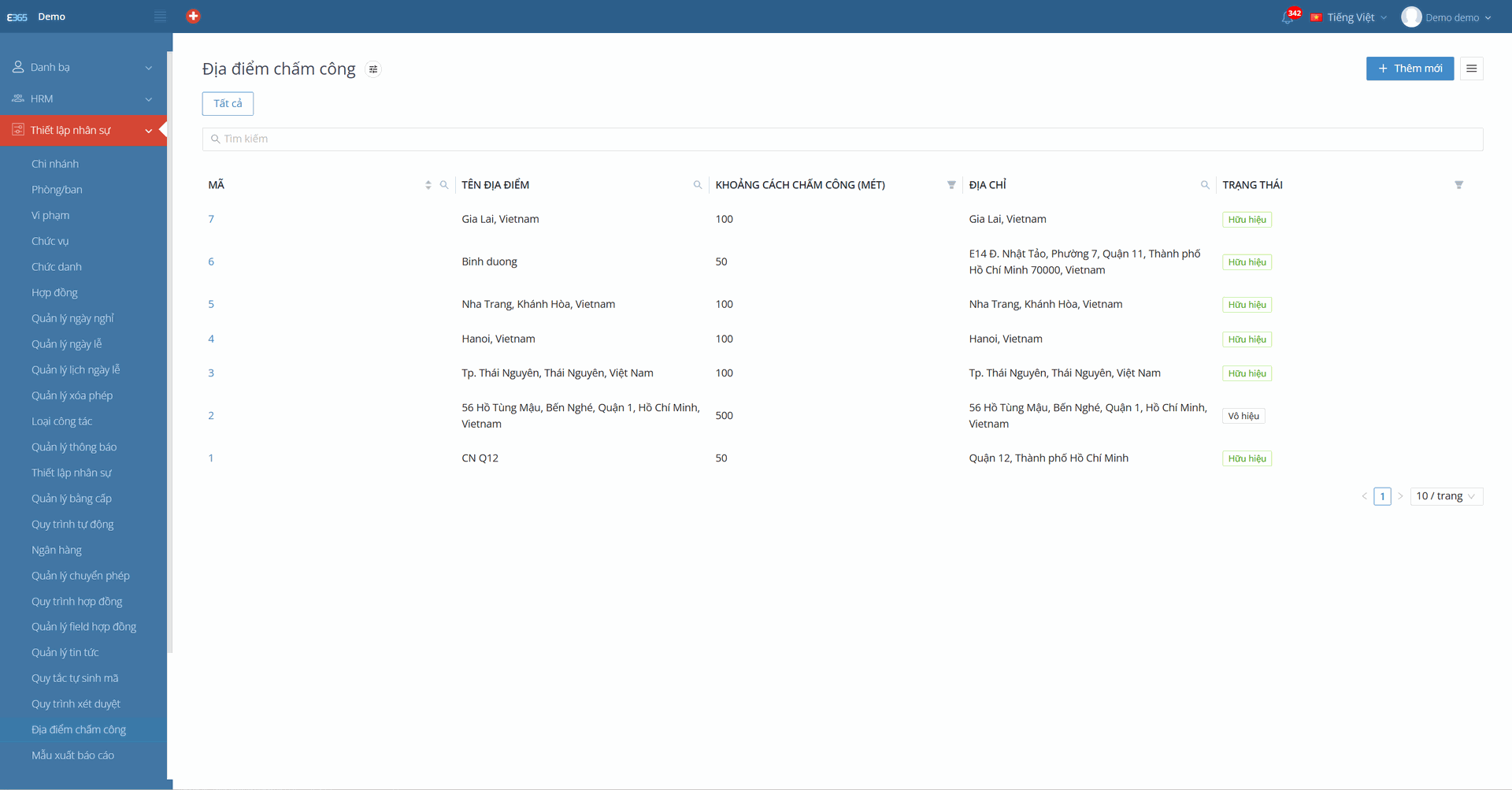 Mục đích: Cài đặt các địa điểm cho phép nhân viên thực hiện chấm công (thường dùng cho chấm công GPS) và bán kính cho phép.