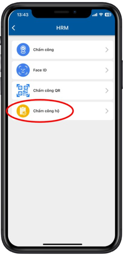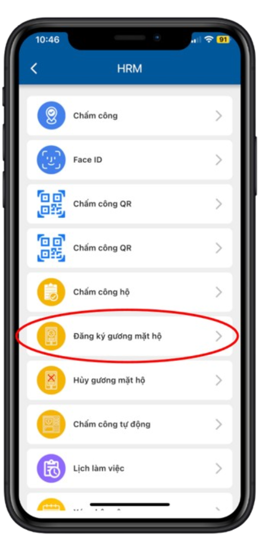 - Truy cập: Tại màn hình chính, chọn mục HRM -> Chọn Đăng ký gương mặt hộ.