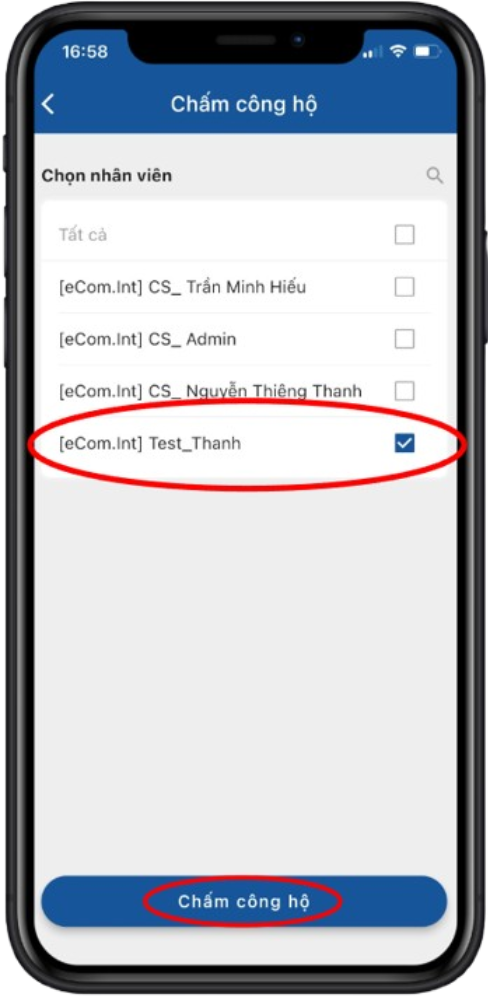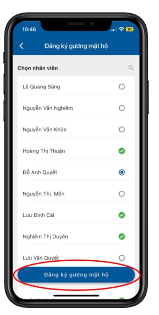 - Chọn nhân viên: Tích chọn tên nhân viên trong danh sách -> Nhấn nút Đăng ký gương mặt hộ (màu xanh ở đáy màn hình).