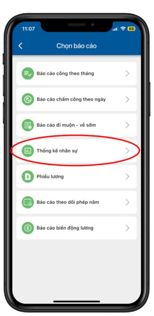 - Chọn báo cáo: Trong danh sách báo cáo, nhấn vào dòng Thống kê nhân sự.