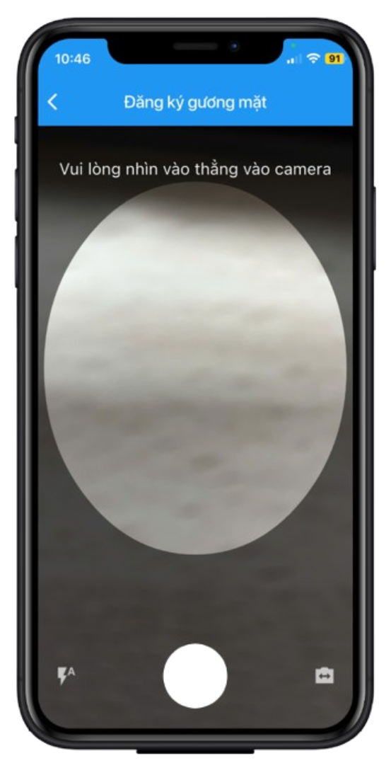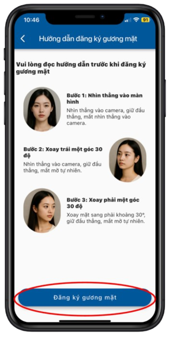 - Thực hiện quét: Đọc hướng dẫn và nhấn nút Đăng ký gương mặt. Di chuyển camera để quét khuôn mặt nhân viên theo 3 tư thế: Nhìn thẳng, Quay trái 30°, Quay phải 30°.