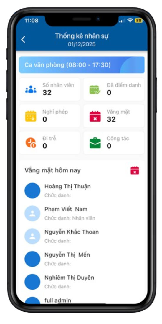 - Xem chi tiết: Nhấn vào thẻ của một ca cụ thể (ví dụ: Ca văn phòng) để xem danh sách nhân viên chi tiết bên dưới (như danh sách vắng mặt).
